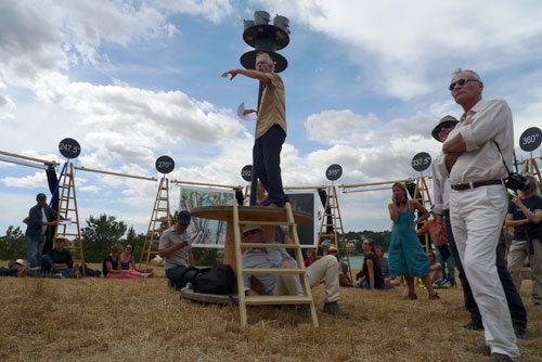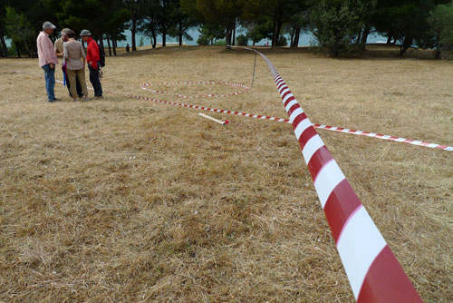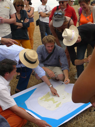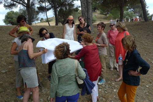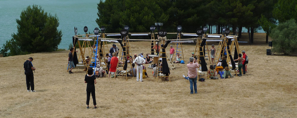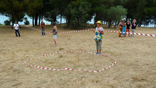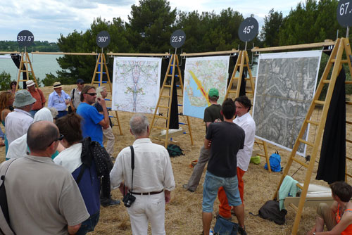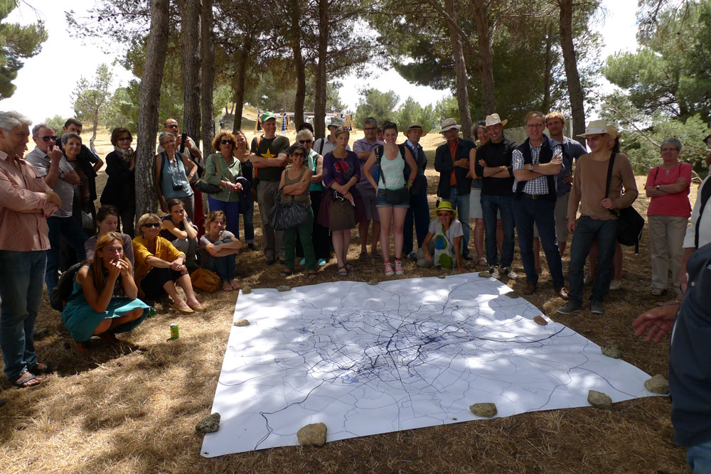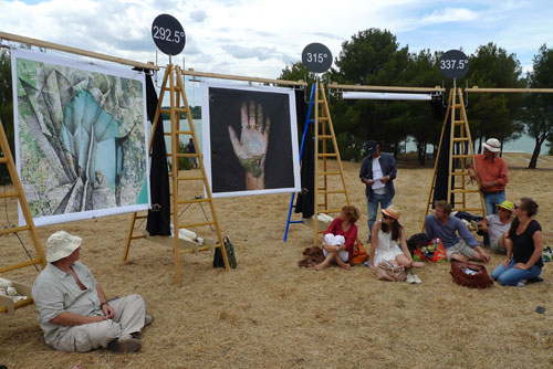 Staged on the Castellan Hill peninsula in Istres, overlooking the Étang de l'Olivier The Fold of the Map was a unique public performance in three parts. The show began with a warm introduction by one of the instigators of the project Thierry Kressmann followed by a short presentation of selected GPS drawings displayed under the shadows of the trees. |