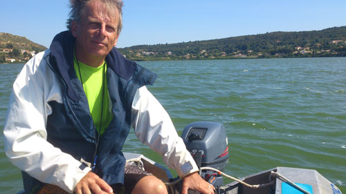 Initially I had planned to immerse myself in the water by swimming along the route of the drawing. As I trained my body at the local pool I began to realise the difficulties that would arise from holding a GPS receiver in one hand and paddling with the other; I'd be going around in circles. Even if I were to strap the receiver to my head, or construct a small boat tethered to my waist (as I did for I Was There and There I Was, 2011), I would still need to refer at regular intervals to the screen of the device to guide my sketches. So I requested we hire a kayak, and in preparation had a lesson on the River Thames. When I arrived at the Étang de l'Olivier the sun persisted pleasantly but the 45km winds were so great that it was too choppy to venture out onto the water. I waited for three days. I contemplated the drawing at the edge of the lake and along the two hour walk to circumnavigate it's edge. All the while I saw no evidence of boats or swimmers, only the occasional fisherman casting their lines from the lakeside. For contingency I created a GPS drawing of the foetus on the peninsula but I wasn't satisfied with the results. The area was just too small to capture the little fingers and toes. What I really needed was a motorboat. |