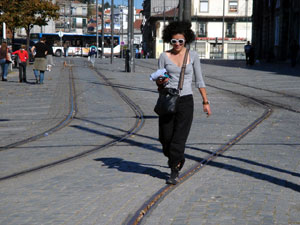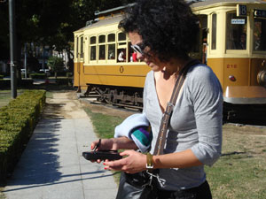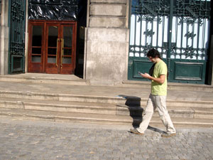 | The participants made their own maps by walking around the features and furniture of the square. We started by walking around the fountain outside the main entrance of the Reitoria, and then split up to capture individual maps of the area. There were tracings of the pedestrian edges, like along the low walls around planting areas, and around the pond. There were methodical walks along the tram tracks, and tracks that just wandered around from thing to thing as if mapping a conversation. After about an hour we all retreated inside to We combined all the individual mapping narratives together to produce a collective map of the workshop. It is a map where